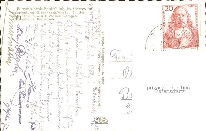 72028670 alte Postkarte Groenenbach Bad Pension Schlosscafe postalisch gelaufen Erhaltung siehe scans KatCode: 11110009778144