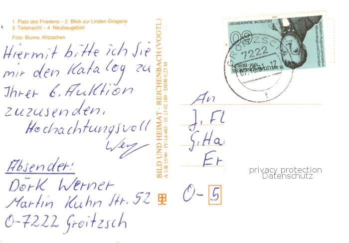 73860655 alte Postkarte Groitzsch Borna Platz des Friedens Linden-Drogerie Teilansicht Neubaugebiet postalisch gelaufen Erhaltung siehe scans [FriedD77] KatCode: 11110014379260