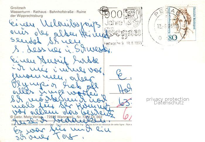 73269315 alte Postkarte Groitzsch Pegau Wasserturm Rathaus Bahnhofstrasse Ruine Wipprechtsburg postalisch gelaufen Erhaltung siehe scans [FriedD77] KatCode: 11110014379260