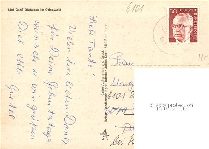 73233457 alte Postkarte Gross-Bieberau Odenwald Kirche Turm Panorama postalisch gelaufen Erhaltung siehe scans [KathaD81] KatCode: 11110006432009