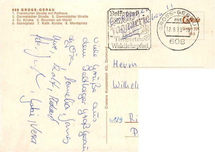 73875131 alte Postkarte Gross-Gerau Frankfurter Strasse Rathaus Darmstaedter Strasse Kirche Brunnen Markt Platz postalisch gelaufen Erhaltung siehe scans [FriedD77] KatCode: 11110006433006