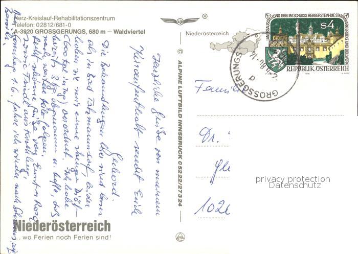 72496233 alte Postkarte Gross Gerungs Herz Kreislauf Rehabilitationszentrum Fliegeraufnahme postalisch gelaufen Erhaltung siehe scans KatCode: 11390124032508