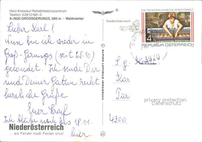 72415788 alte Postkarte Gross Gerungs Rehabilitationszentrum Fliegeraufnahme postalisch gelaufen Erhaltung siehe scans KatCode: 11390124032508