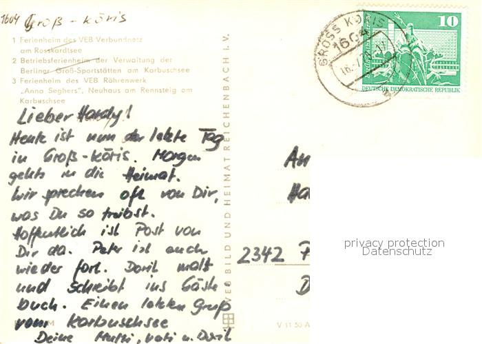 73094128 alte Postkarte Gross Koeris Ferienheime Anna Seghers Kabuschsee Rosskardtsee postalisch gelaufen Erhaltung siehe scans [LiesaD40] KatCode: 11110012061192