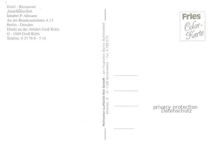 74095650 Gross-Koeris Grosskoeris Dahme-Spreewald Brandenburg Hotel Restaurant Seeschloesschen Fliegeraufnahme postalisch nicht gelaufen Erhaltung siehe scans [WerneD78] KatCode: 11110012061192