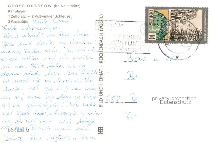 73865083 alte Postkarte Gross Quassow Kanulager Zeltplatz am Woblitzsee Vosswinkler Schleuse Gaststaette postalisch gelaufen Erhaltung siehe scans [FriedD77] KatCode: 11110013055070