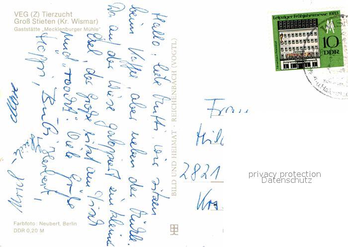 72687271 alte Postkarte Gross Stieten Gaststaette Mecklenburger Muehle VEG Tierzucht postalisch gelaufen Erhaltung siehe scans [FriedD77] KatCode: 11110013058042