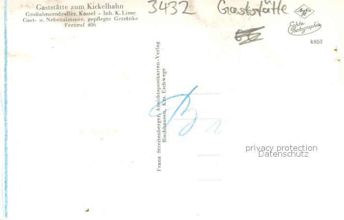 73703070 Grossalmerode Gaststaette zum Kickelhahn Innen und Aussen postalisch nicht gelaufen Erhaltung siehe scans [LiesaD40] KatCode: 11110006636004