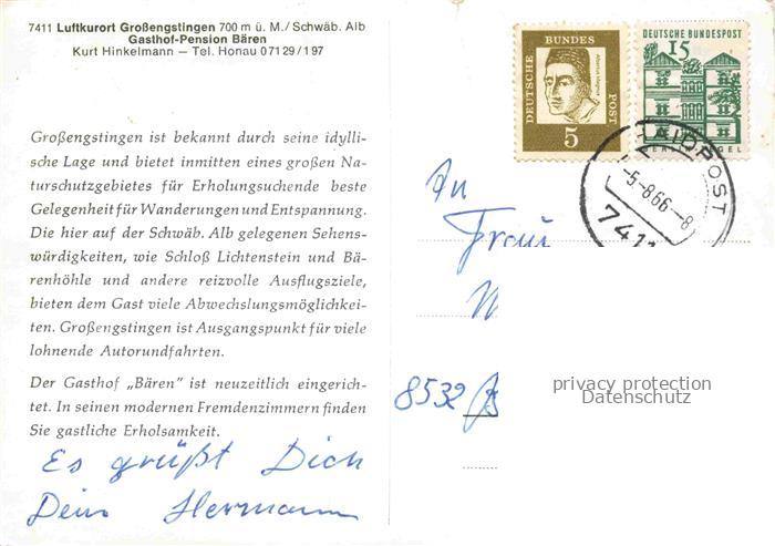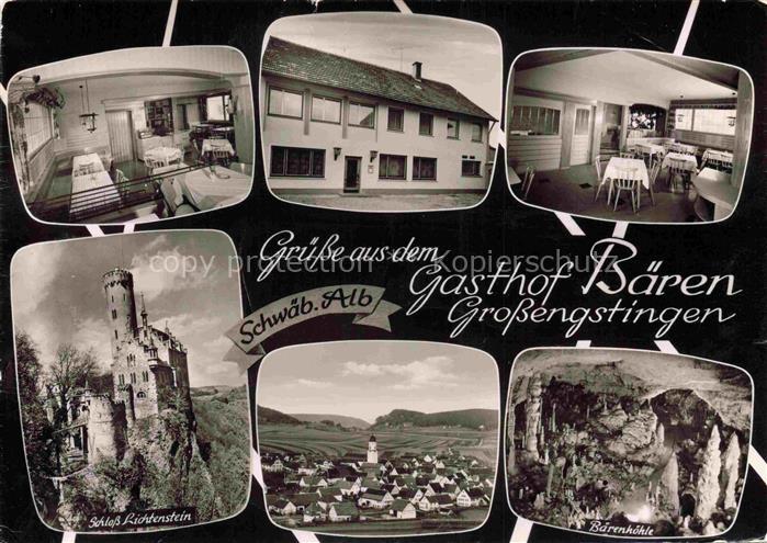 74097890 alte Postkarte Grossengstingen Engstingen Reutlingen BW Gasthof Baeren Gastraeume Schoss Lichtenstein Panorama Baerenhoehle postalisch gelaufen Erhaltung siehe scans [WerneD78] KatCode: 11110008415089