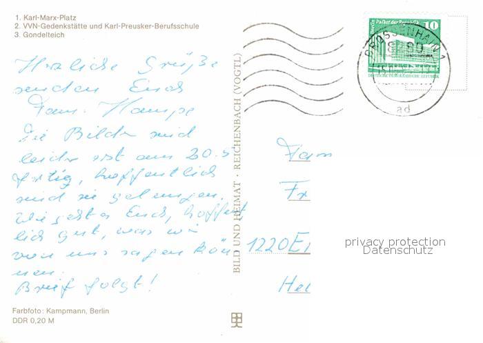 72636240 alte Postkarte Grossenhain Sachsen Karl Marx Platz VVN Gedenkstaette Karl Preusker Berufsschule Gondelteich postalisch gelaufen Erhaltung siehe scans [WerneD78] KatCode: 11110014285100