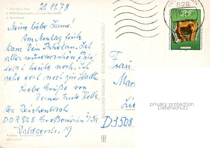 73801836 alte Postkarte Grossenhain Sachsen Karl Marx Platz WN Gedenkstaette und neue Berufsschule Gondelteich postalisch gelaufen Erhaltung siehe scans [WerneD78] KatCode: 11110014285100
