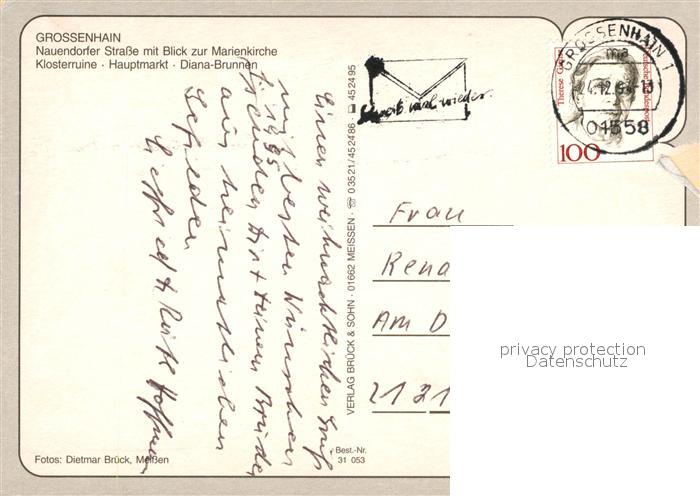 73574277 alte Postkarte Grossenhain Sachsen Nauendorfer Strasse Marienkirche Klosterruine Hauptmarkt Dianabrunnen postalisch gelaufen Erhaltung siehe scans [FriedD77] KatCode: 11110014285100