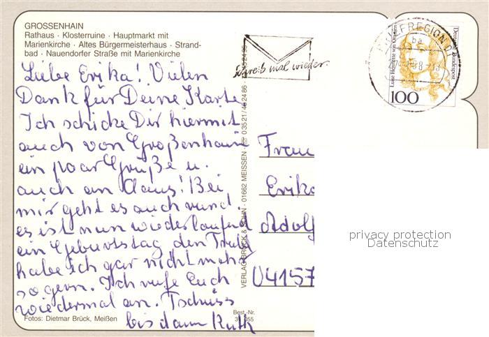73839969 alte Postkarte Grossenhain Sachsen Rathaus Klosterruine Hauptmarkt Marienkirche Altes Buergermeisterhaus Strandbad Nauendorfer Strasse mit Marienkirche postalisch gelaufen Erhaltung siehe scans [WerneD78] KatCode: 11110014285100