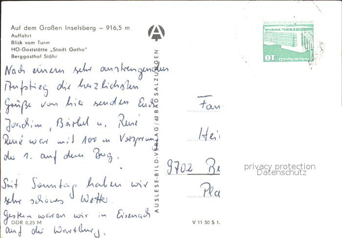 72332096 alte Postkarte Grosser Inselsberg Turm Bus HO Gaststaette Stadt Gotha Berggasthof Stoehr postalisch gelaufen Erhaltung siehe scans KatCode: 11110016066014