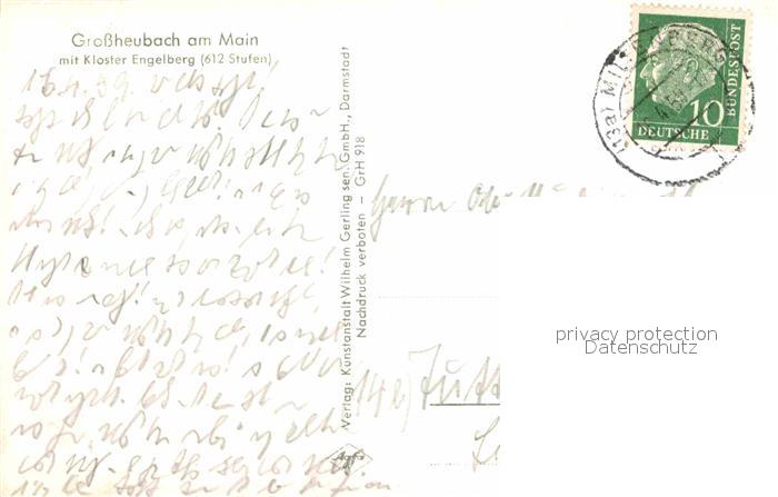 72881207 alte Postkarte Grossheubach Blick ueber den Main Kirche Kloster Engelberg postalisch gelaufen Erhaltung siehe scans [FriedD77] KatCode: 11110009676125