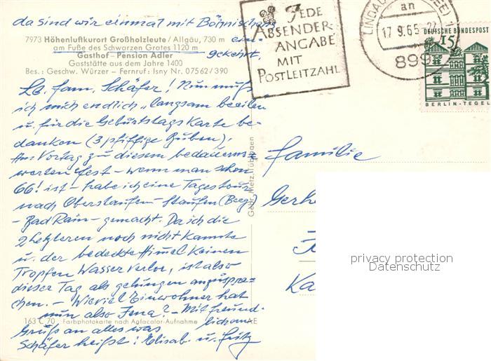 73801332 alte Postkarte Grossholzleute Gasthof Pension Adler am Fusse des Schwarzen Grates Allgaeuer Alpen postalisch gelaufen Erhaltung siehe scans [FriedD77] KatCode: 11110008436049