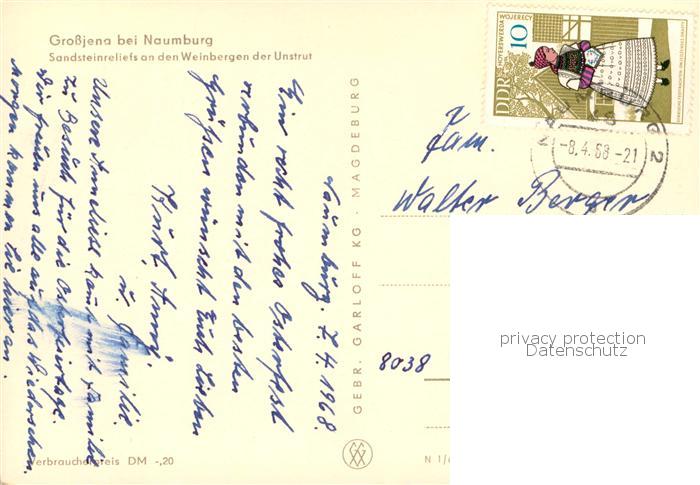 73750935 alte Postkarte Grossjena Sandsteinreliefs an den Weinbergen der Unstrut postalisch gelaufen Erhaltung siehe scans [WerneD78] KatCode: 11110015084355