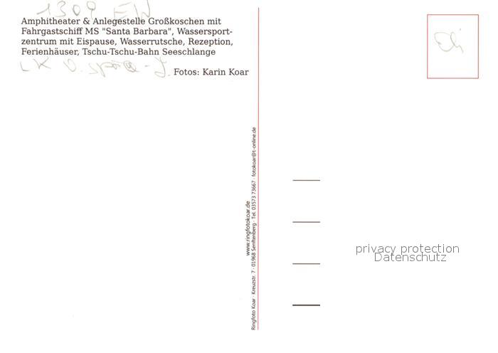 73269313 Grosskoschen Amphitheater Anlegestelle Fahrgastschiff MS Santa Barbara Wassersportzentrum Ferienhaeuser Tschu Tschu Bahn Seeschlange Herz postalisch nicht gelaufen Erhaltung siehe scans [FriedD77] KatCode: 11110012066304