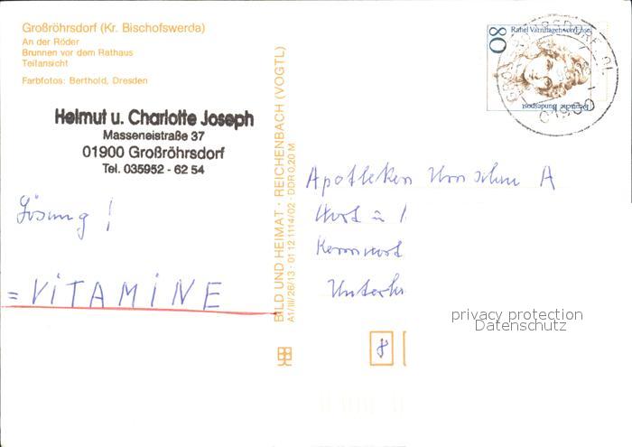 72414921 alte Postkarte Grossroehrsdorf Sachsen An der Roeder Brunnen Rathaus Stadtansicht postalisch gelaufen Erhaltung siehe scans KatCode: 11110014292180