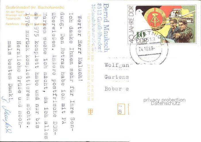 72404526 alte Postkarte Grossroehrsdorf Sachsen An der Roeder Brunnen vorm Rathaus Teilansicht postalisch gelaufen Erhaltung siehe scans KatCode: 11110014292180