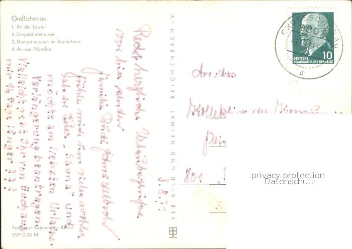 72353549 alte Postkarte Grossschoenau Sachsen Lausur Umgebindehaeuser Damastmuseum Kupferhaus Mandau postalisch gelaufen Erhaltung siehe scans KatCode: 11110014286120