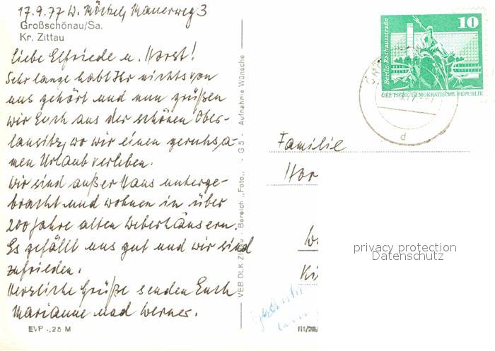 72703410 alte Postkarte Grossschoenau Sachsen Partie an der Kirche postalisch gelaufen Erhaltung siehe scans [FriedD77] KatCode: 11110014286120