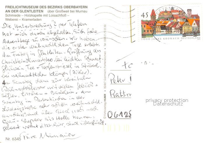 73634002 alte Postkarte Grossweil Freilichtmuseum an der Glentleiten Schmiede Holzkapelle Floss Weberei Kramerladen postalisch gelaufen Erhaltung siehe scans [FriedD77] KatCode: 11110009180119