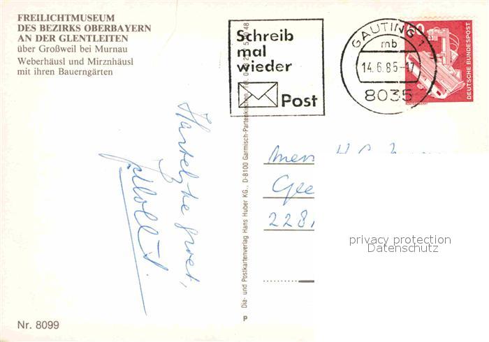 72924972 alte Postkarte Grossweil Freilichtmuseum Weberhaeusl Mirznhaeusl postalisch gelaufen Erhaltung siehe scans [NatalD47] KatCode: 11110009180119
