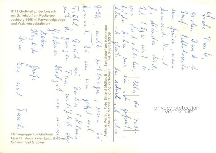 73736315 Grossweil Panorama mit Schlehdorf am Kochelsee Jochberg Karwendelgebirge Walchenseekraftwerk Plattlergruppe Trachten Geschaeftshaus Schwimmbad postalisch nicht gelaufen Erhaltung siehe scans [FriedD77] KatCode: 11110009180119