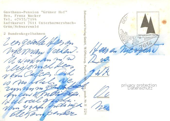 73219185 alte Postkarte Gruen Unterharmersbach Gasthaus Pension Gruener Hof postalisch gelaufen Erhaltung siehe scans [FriedD77] KatCode: 11110008317146