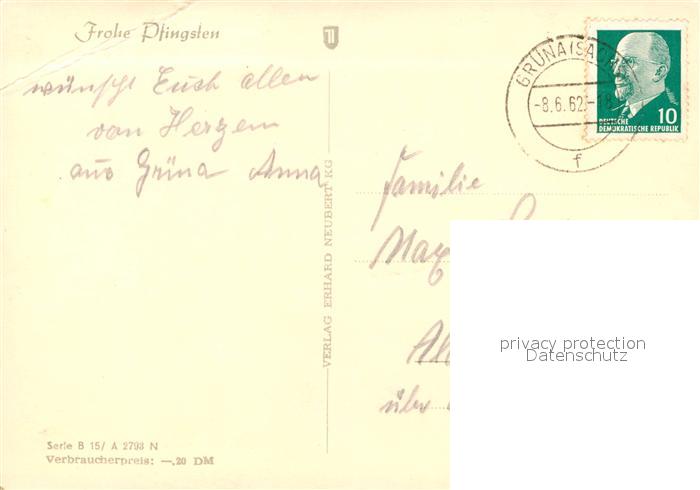73306269 alte Postkarte Gruena Bad Pfingstgruesse Kirche Frau mit Korb postalisch gelaufen Erhaltung siehe scans [KathaD81] KatCode: 11110014161000