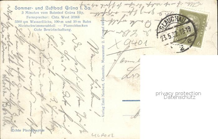 32207802 alte Postkarte Gruena Bad Sommer- und Luftbad postalisch gelaufen Erhaltung siehe scans KatCode: 11110014161000
