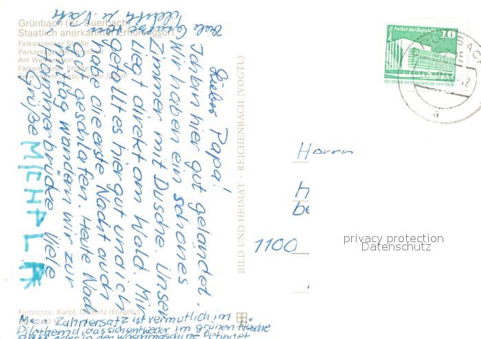 73606952 alte Postkarte Gruenbach Auerbach Erzgebirge Falkensteiner Strasse Paranlage Ehrenmal Am Wendelstein Ferienheim Geschwister Scholl postalisch gelaufen Erhaltung siehe scans [WerneD78] KatCode: 11110014188020