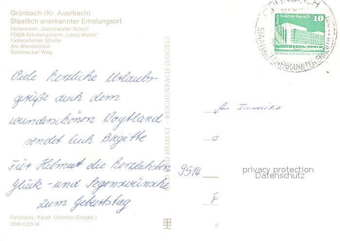 73124132 alte Postkarte Gruenbach Auerbach Erzgebirge Ferienheime Geschwinster Scholl Louis Mueller Falkensteiner-Strasse Wendelstein Schoenecker-Weg postalisch gelaufen Erhaltung siehe scans [LiesaD40] KatCode: 11110014188020