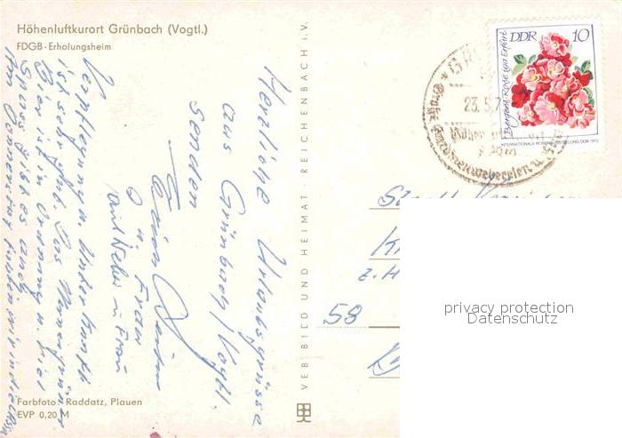 72725631 alte Postkarte Gruenbach Vogtland FDGB Erholungsheim postalisch gelaufen Erhaltung siehe scans [LiesaD40] KatCode: 11110014178190