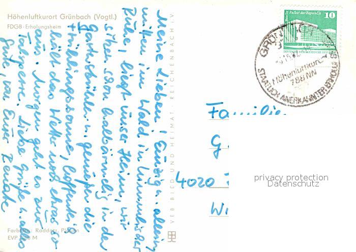 72721926 alte Postkarte Gruenbach Vogtland FDGB Erholungsheim postalisch gelaufen Erhaltung siehe scans [LiesaD40] KatCode: 11110014178190