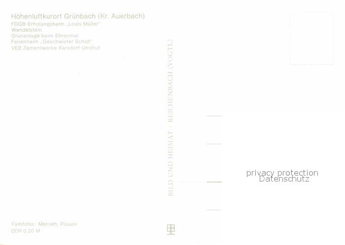 72654332 Gruenbach Vogtland FDGB Erholungsheim Louis Mueller Wendelstein Gruenanlage Ehrenmal Ferienheim Geschwister Scholl Zementwerke Karsdorf Unstrut postalisch nicht gelaufen Erhaltung siehe scans [WerneD78] KatCode: 11110014178190