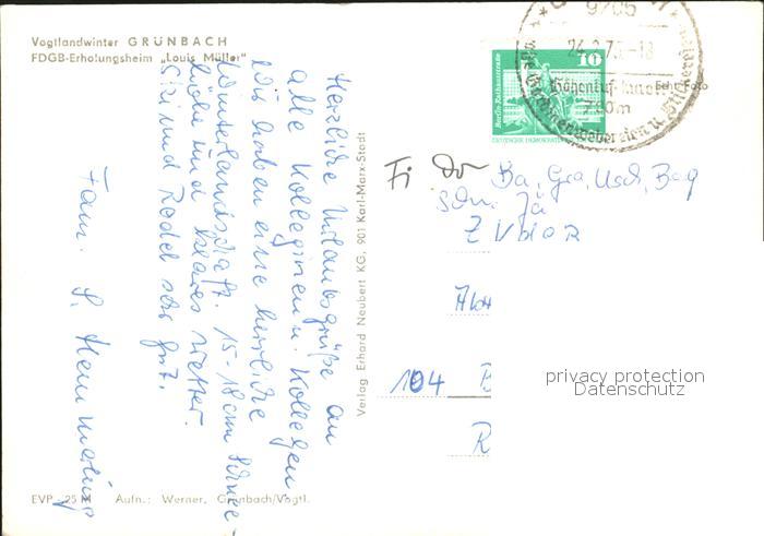 72055262 alte Postkarte Gruenbach Vogtland FDGB Erholungsheim Louis Mueller Winteridyll postalisch gelaufen Erhaltung siehe scans KatCode: 11110014178190