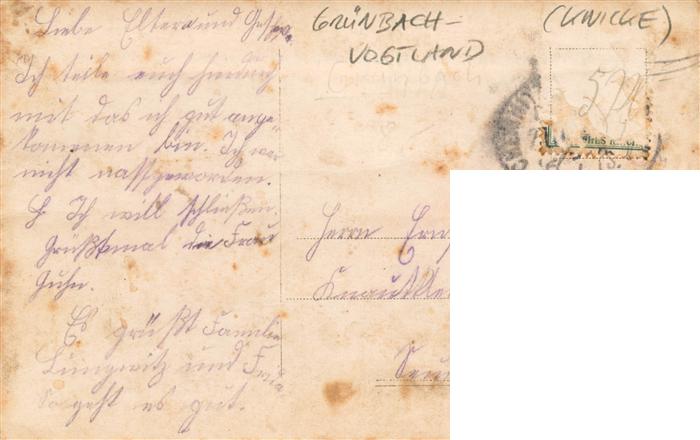 73940249 Gruenbach Vogtland Ortspartie postalisch gelaufen Erhaltung siehe scans [WerneD78] alte Postkarte Wern Katcode 11110014178190