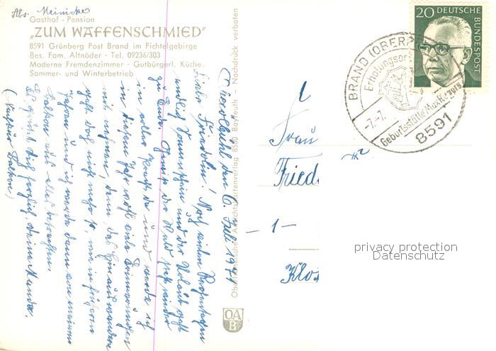73725587 alte Postkarte Gruenberg Oberpfalz Gasthof Pension zum Waffenschmied Resetaurant Partie am Bach postalisch gelaufen Erhaltung siehe scans [FriedD77] KatCode: 11110009377113