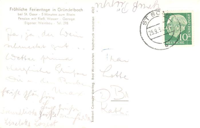 73948894 Gruendelbach St Goar Rhein Gasthaus Pension Muehlenschenke Panorama Gruendelbachtal postalisch gelaufen Erhaltung siehe scans [FriedD77] alte Postkarte Frie Katcode 11110007140133