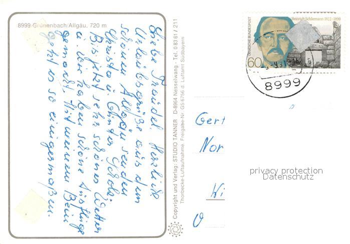 73008407 alte Postkarte Gruenenbach Allgaeu Fliegeraufnahme postalisch gelaufen Erhaltung siehe scans [WerneD78] KatCode: 11110009776113