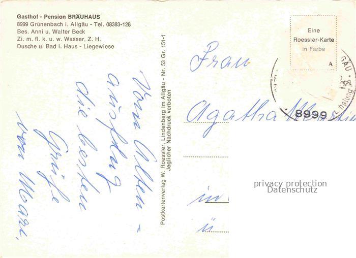 74013713 alte Postkarte Gruenenbach Allgaeu Gasthof Pension Braeuhaus Gastraum Wasserfall postalisch gelaufen Erhaltung siehe scans [FriedD77] KatCode: 11110009776113