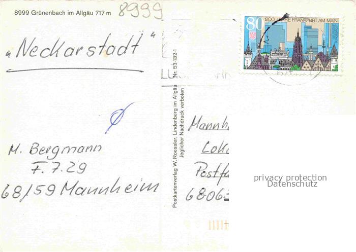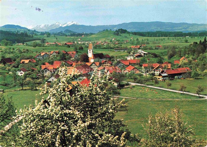 Gruenenbach Allgaeu Lindau Bayern Ortsansicht mit Kirche Baumbluete Alpenpanorama postalisch gelaufen Erhaltung siehe scans [FriedD77] alte Postkarte Frie Katcode 11110009776113