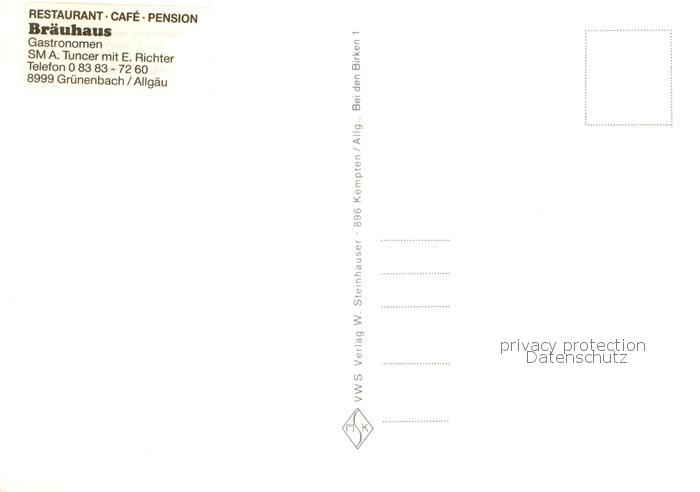 73845694 Gruenenbach Allgaeu Restaurant Cafe Pension Braeuhaus postalisch nicht gelaufen Erhaltung siehe scans [FriedD77] KatCode: 11110009776113