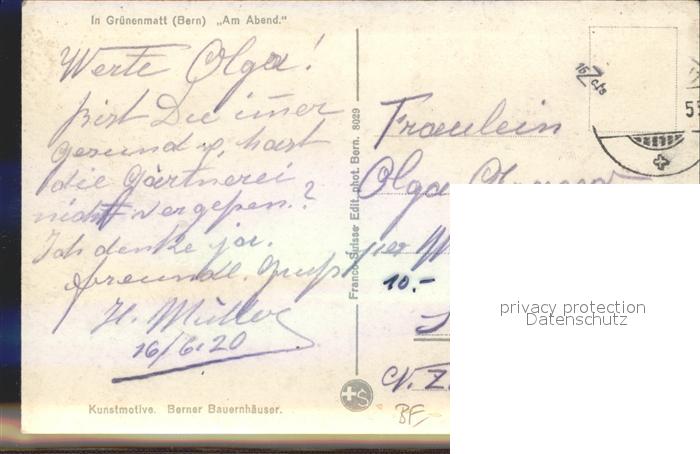 12337612 alte Postkarte Gruenenmatt Berner Bauernhaus Am Abend postalisch gelaufen Erhaltung siehe scans KatCode: 11470060245840