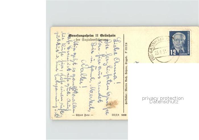 71973899 alte Postkarte Gruenhain-Beierfeld Genesungsheim II Sozialversicherung postalisch gelaufen Erhaltung siehe scans KatCode: 11110014191050