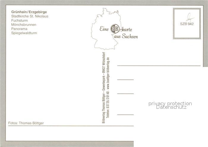 73269319 Gruenhain Erzgebirge Stadtkirche St Nikolaus Fuchsturm Moenchsbrunnen Spiegelwaldturm Panorama postalisch nicht gelaufen Erhaltung siehe scans [FriedD77] KatCode: 11110014191050