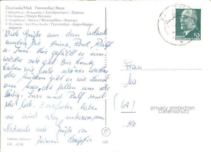 72135953 alte Postkarte Gruenheide Mark Altbuchhorst Anlegestelle Peetzsee Fangschleuse Werlsee Karl Marx Strasse postalisch gelaufen KatCode: 11110012067201