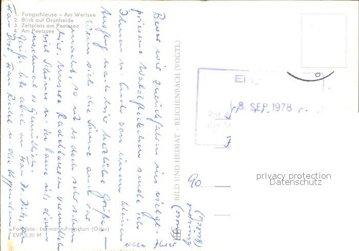 72418508 alte Postkarte Gruenheide Mark Fangschleuse Werlsee Zeltplatz Peetzsee postalisch gelaufen Erhaltung siehe scans KatCode: 11110012067201